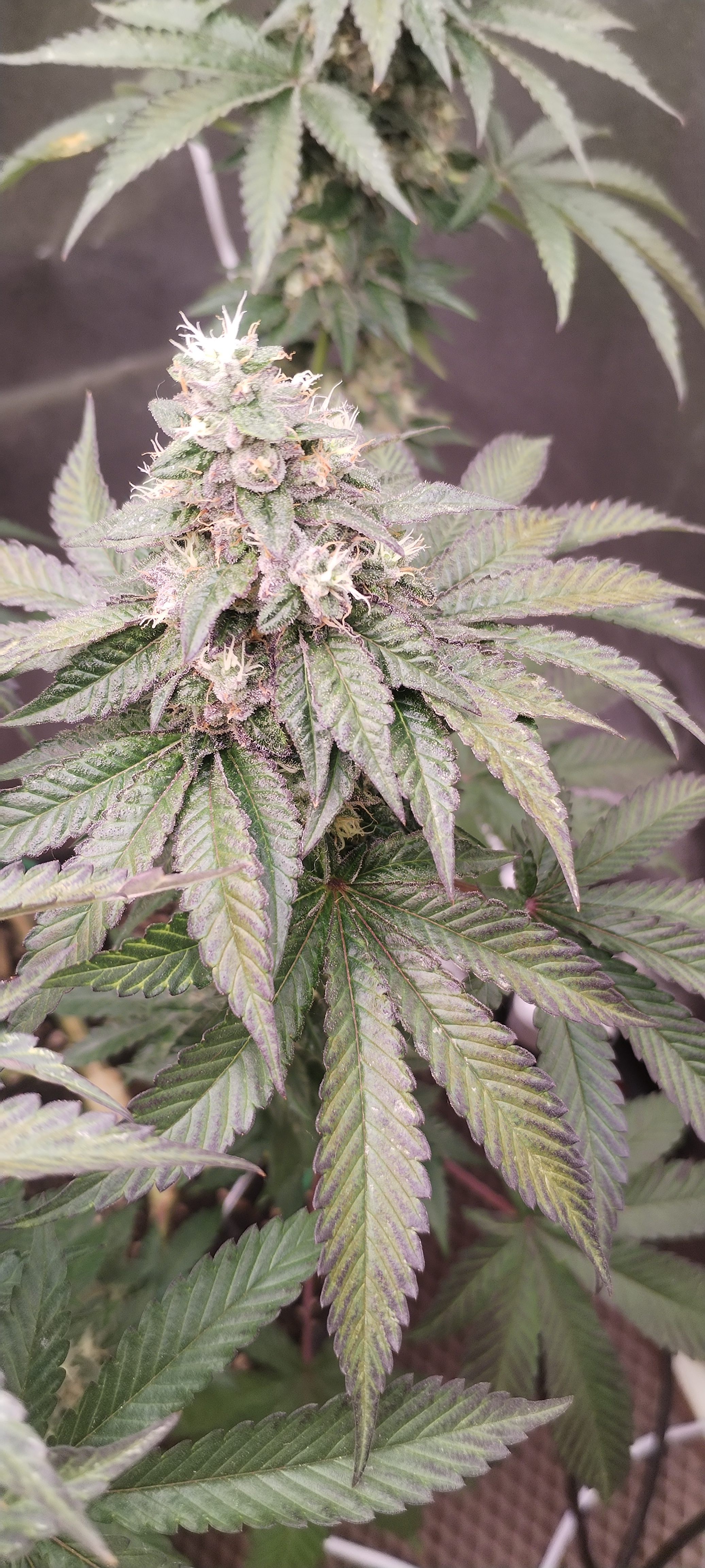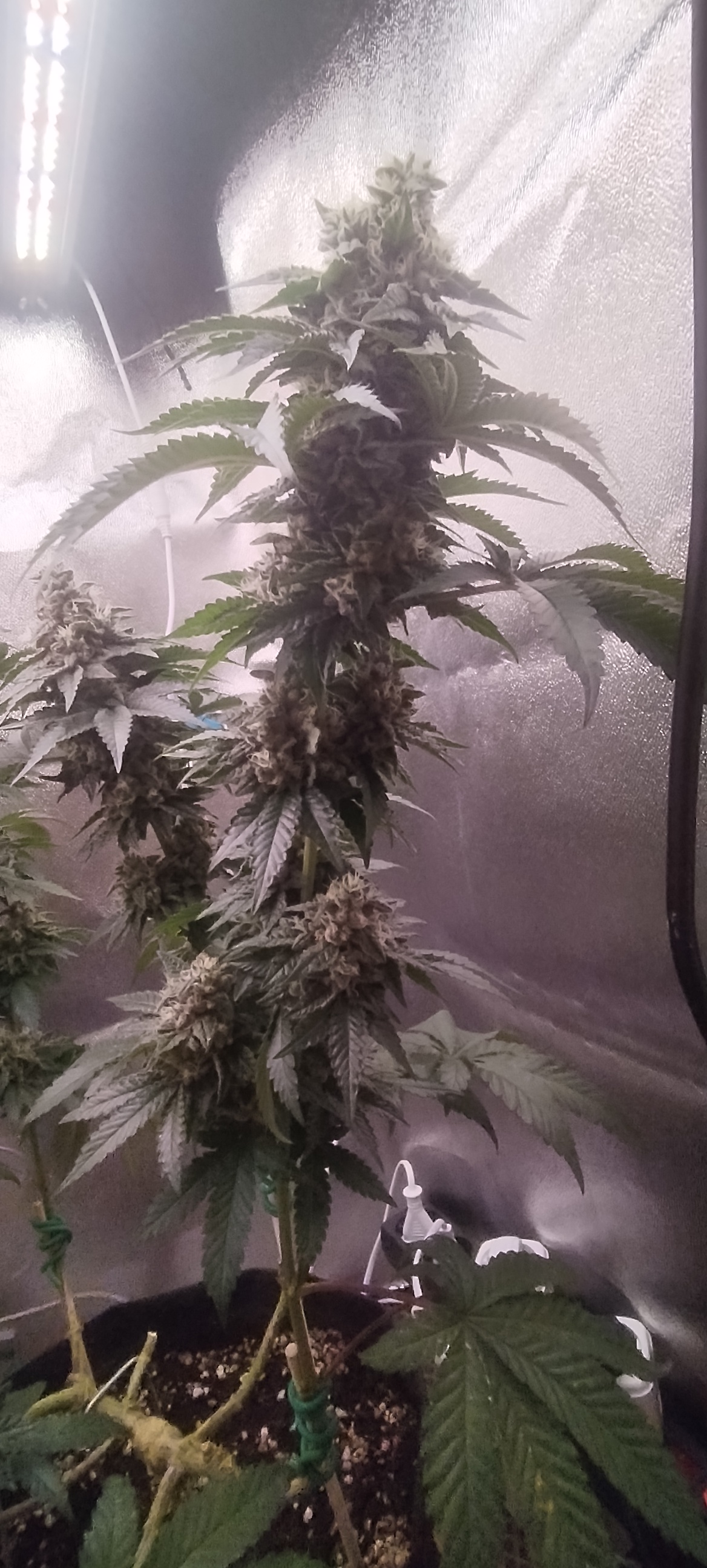 Куст под "Мейнлинингом" (самая жёсткая тренировка), кто не знал. Очень стрессоусточивый, крепкий, очень много листвы, вся темно-зелёная! Сильный сорт!! Дефолиацию постоянно проводил, очень липкий сахарный, на цветении прожорлив, любит удобрения, меры не знает, передоз не ловит! Со временем цвет листьев начал принимать фиолетовый оттенок. Сейчас вообще зрелизная, фото не передаст. Ещё не харвнул, цветёт! Изначально было сформирован но 8 кол, но аппетит взял своё! Эффект бомбический, каждый раз разматывает!