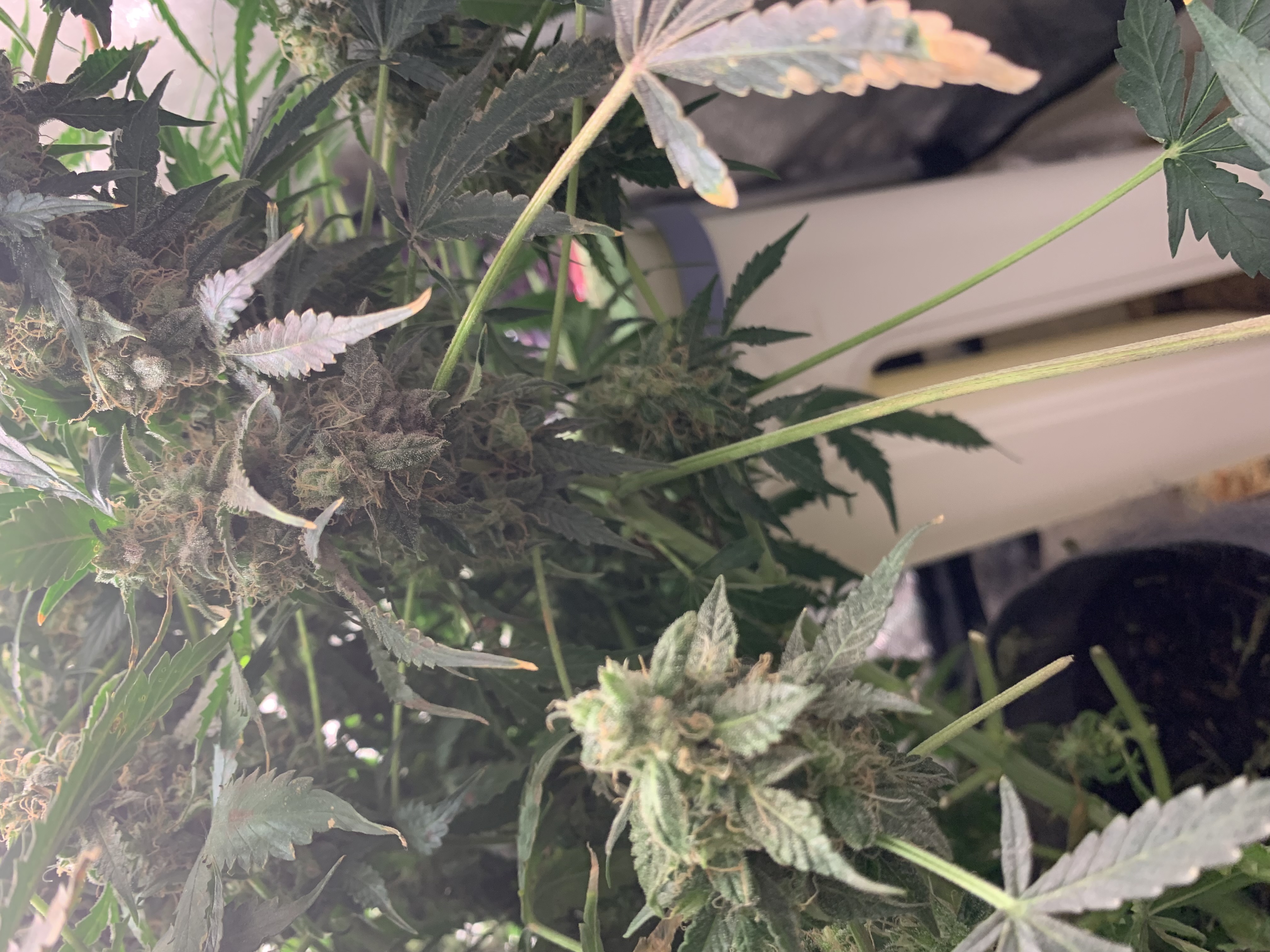 114 день грова. Шишки становятся фиолетовыми, листва начинает желтеть. Трихомы местами янтарь, в основном прозрачные ещё, но сил тянуть с харвестом почти нет. Куст уже на промывке, думаю еще 2-3 пролива через сутки и «под корень». Запах умеренный сладкий, не едкий как у некоторых сортов. Кстати низов очень много будет,я снимал на дегустацию пробу попкорна; эффект есть , сативный, надеюсь верхушка накурит как надо. В общем у кого есть время и желание поднять мимозу, можете уже приступать)